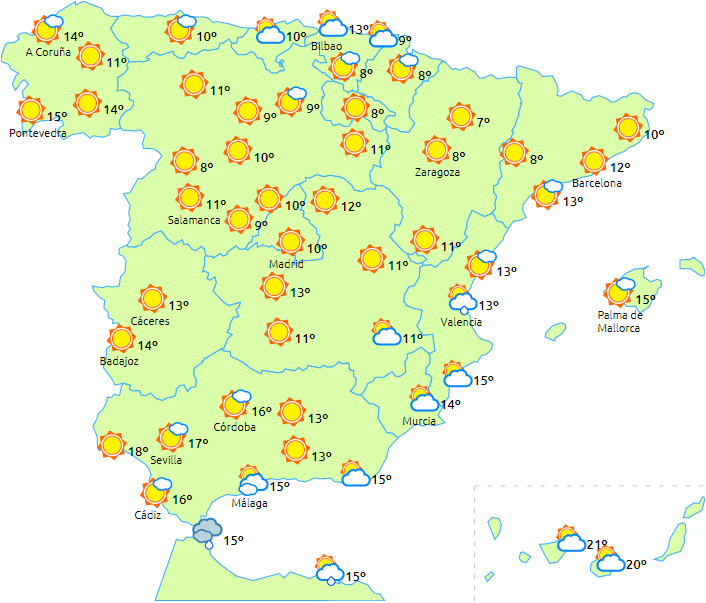 Dagstemperaturerne er faldende på den sydlige halvdel af halvøen, mens de stiger en smule i nordvest og det nordlige af Middelhavsområdet. Nattemperaturerne stiger på den nordøstlige del af halvøen. Der vil fortsat være frost i de nordlige, centrale og østlige egne. Koldest dog i Pyrenæerne, i dalene på den nordlige højslette og i og omkring De Iberiske Randbjerge.