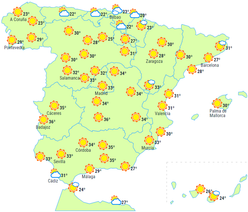 Temperaturerne vil stige i det meste af landet, men mere markant i områderne omkring Málaga og Cádiz, mens der sker et fald i maksimumtemperaturerne i den nordlige del af fastlandet. Temperaturerne vil overstige 35 grader i det meste af det indre af den sydlige halvdel af halvøen og de indre egne i nordøst, det nordlige højland, det sydlige Galicien og det sydlige og indre af De Kanariske Øer.