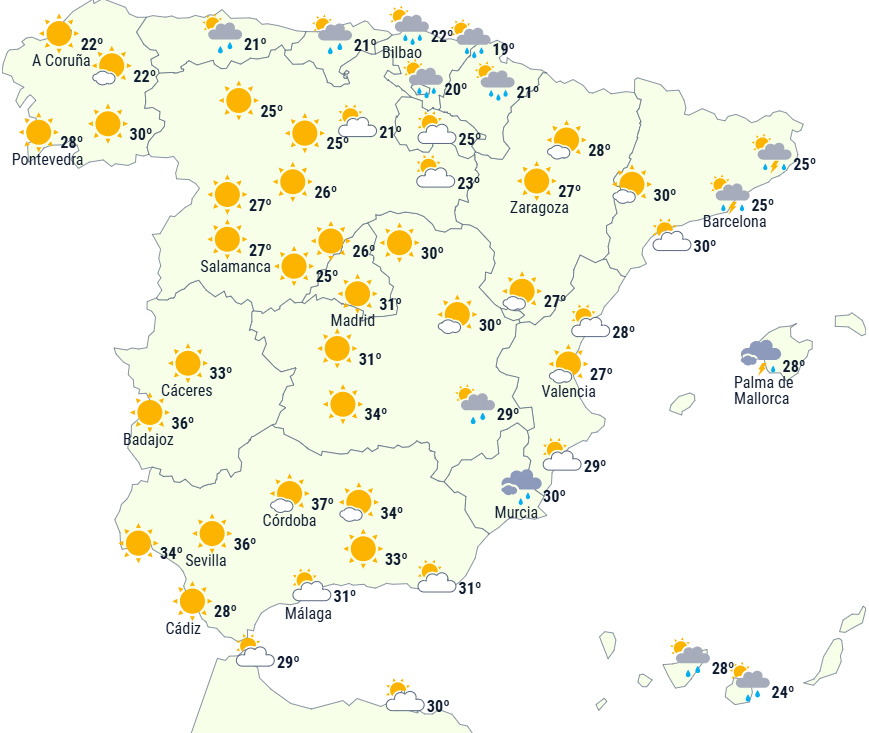 - Dagstemperaturerne er meget høje i de sydvestlige dale på Den Iberiske Halvø, mens nattemperaturerne ikke falder under 20/22 grader i det mediterrane område og i de sydvestlige dale på halvøen.