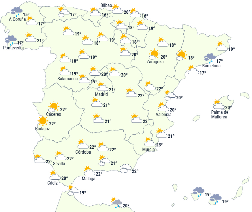 På nær den nordøstlige tredjedel forventes der udvikling skyer i det indre af halvøen med byger ledsaget af lejlighedsvise tordenbyger i de største bjergområder, men det er også muligt i det nordlige højland. Disse vil være mest intense og udbredte i nordvest, hvor de lokalt kan blive kraftige i bjergene i Galicien eller det vestlige Cantábrico.