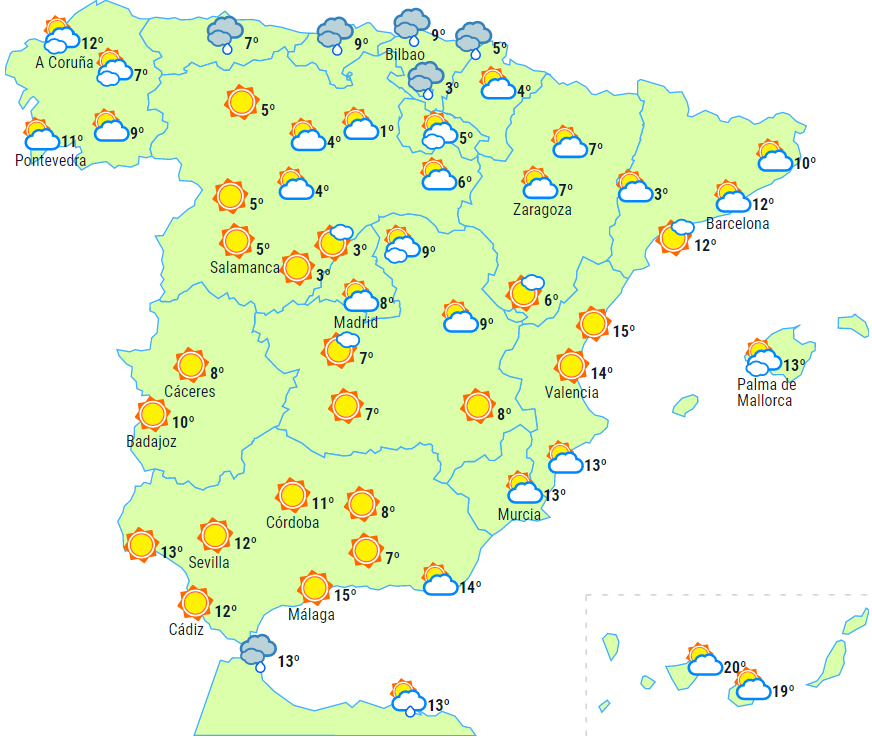 Overskyet eller perioder med det over det meste af den nordlige halvdel af fastlandet med let nedbør ved nordvestkysten, det nordlige Galicien, den øvre Ebro-dal og den nordlige del af De Iberiske Randbjerge.