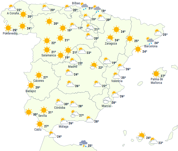 - Dagstemperaturerne forbliver meget høje i de sydvestlige dale på halvøen, hvor der ventes 34 til 36 grader, mens nattetemperaturerne aldrig kommer under 20/22 grader i de mediterrane områder og på den sydvestlige del af halvøen.