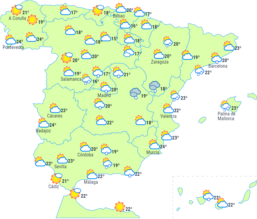 Fortsat ustabilt vejr på halvøen og Balearerne med skyet vejr og mere overskyet i dagens anden halvdel. Der er sandsynlighed for byger og tordenvejr i store dele af de indre egne i syd, halvøens centrale egne og lokalt kraftigt uvejr til de førnævnte områder.