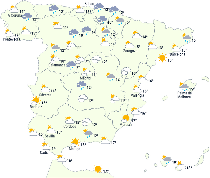 Stabil vejr fortsætter på Den Iberiske Halvø med letskyet himmel over den sydlige halvdel og overskyet eller delvist skyet himmel over den nordlige på grund af fugtig vind fra Det Cantabriske Hav, som vil give nedbør i det meste af den nordlige tredjedel.