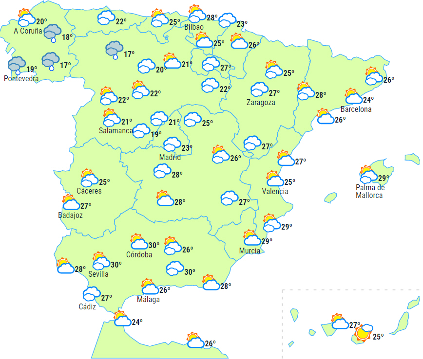 Skyet eller overskyet i Galicien, det vestlige Castilla y León og det nordlige Extremadura med nedbør, som vil aftage i løbet af dagens anden halvdel.