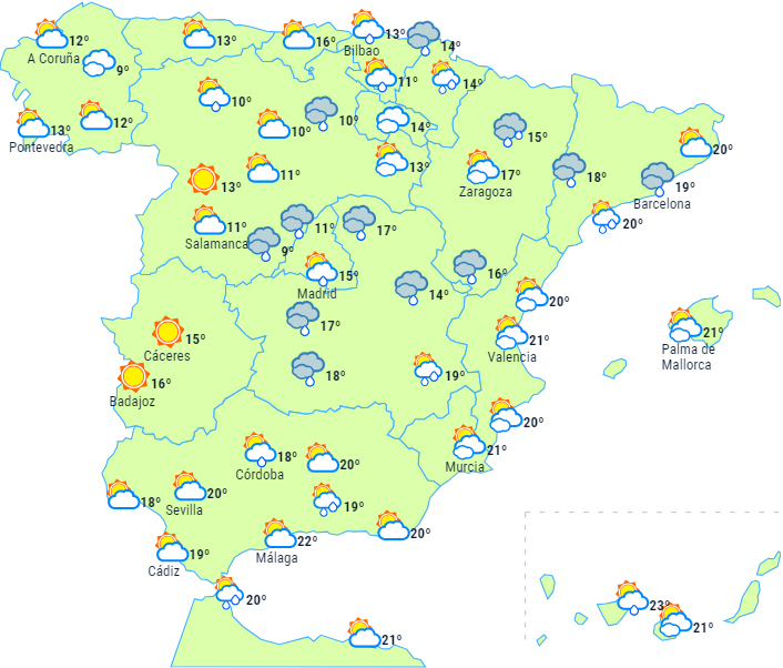 En front forventes at krydse halvøen og give skyet eller overskyet himmel med praktisk talt udbredt nedbør, når den bevæger sig fra vest til øst, men der er så også tendens aftagende skydække efter dens passage. Den forventes at nå Balearerne i slutningen af dagen, hvor lejlighedsvise byger ikke kan udelukkes.