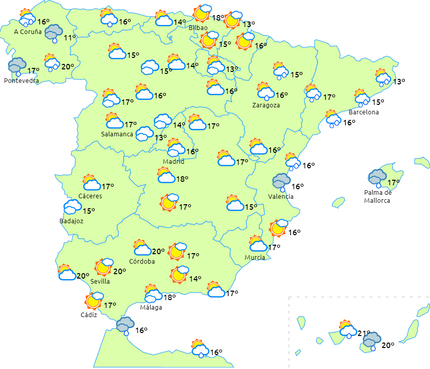 En Atlanterhavsfront nærmer sig Galicien og vil føre mellem- og højtliggende skydække med sig, hvilket ikke udelukker muligheden for let regn sidst på dagen.