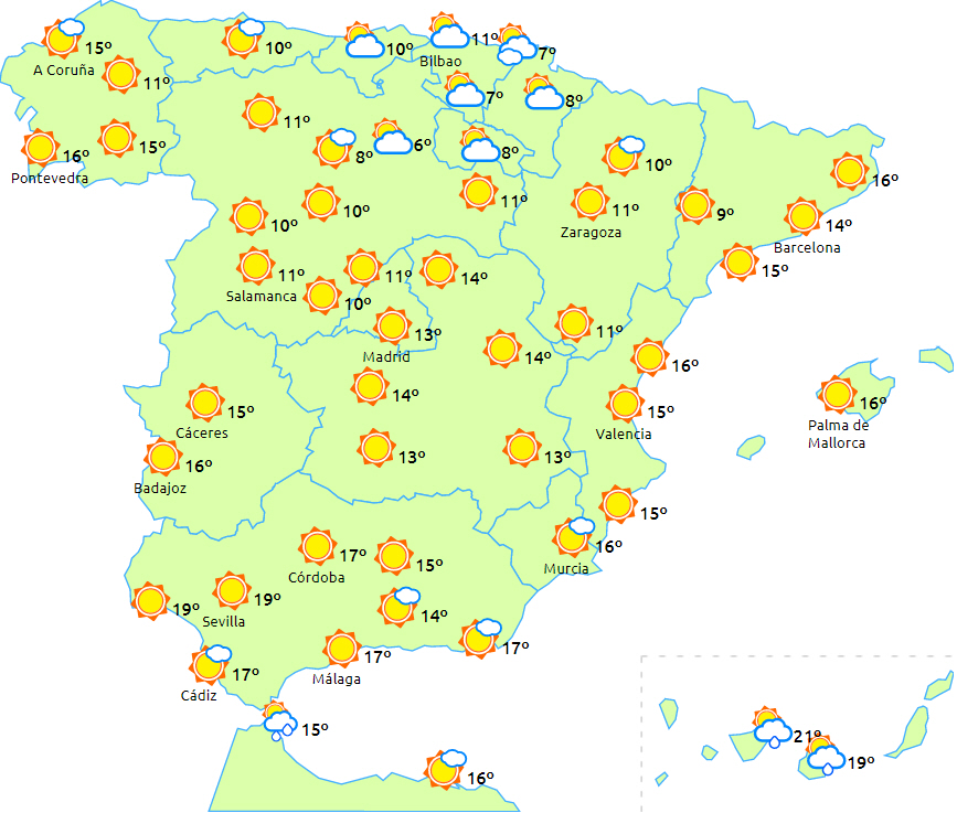 Dagstemperaturerne stiger på halvøen og Balearerne, undtagen helt i det yderste nordlige hjørne, på Middelhavskysten og på De Kanariske Øer, hvor de vil falde en smule. Nattemperaturerne vil falde på den østlige del af halvøen.