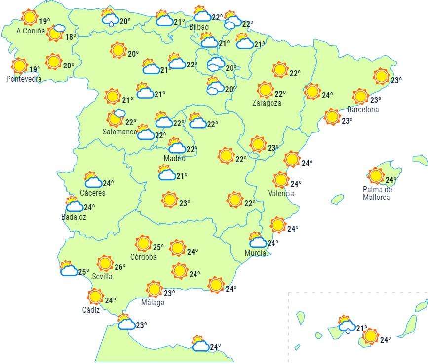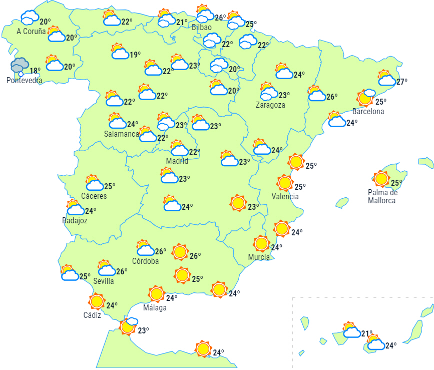 Fortsat stabilt vejr til det meste af halvøen og De Baleariske Øer med letskyet himmel. Men en front forventes at passere langt mod nord, og det giver overskyet himmel til Galicien i løbet af de første timer af dagen, men det bør dog holde tørt.
