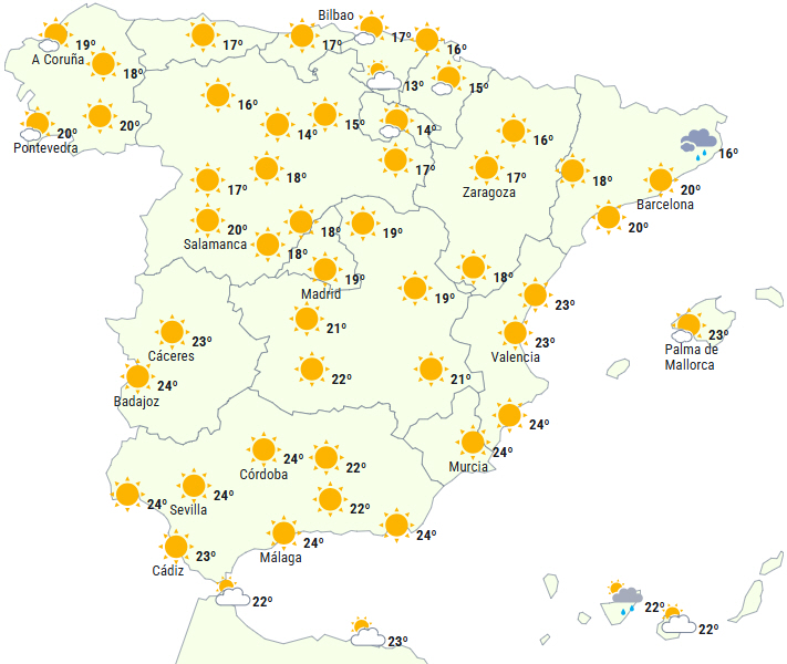 Stabilt vejr i størstedelen af landet med overvejende klar himmel eller letskyet med højtliggende skyer, der trænger ind i løbet af dagen fra vest. Kun forventes der fortsat ustabilitet i og omkring Det Baleariske Hav, hvor der ventes overskyet himmel og sandsynlighed for byger ledsaget af lejlighedsvis torden, og det påvirker helt konkret Mallorca, Menorca og kysterne af Catalonien, men det kan også nå det nordlige af Comunitat Valenciana i dagens første timer.