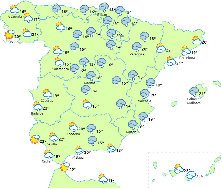 Et lavtryk vest for Galicien resulterer i overskyet himmel over stort set hele halvøen med udbredte regn- og tordenbyger. Med en vis usikkerhedsmargin forventes der lokalt kraftige byger i dele af den østlige halvdel af halvøen, mens de i den sydvestlige og nordøstlige del af halvøen samt på Balearerne vil være mindre sandsynlige og svagere.