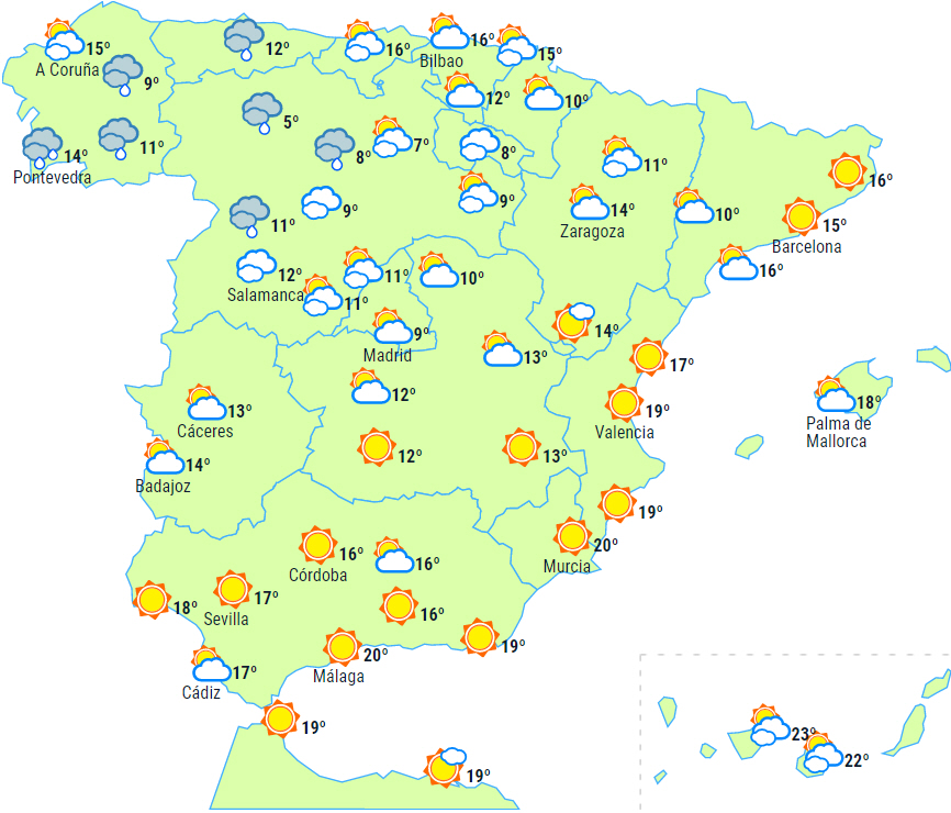 Over den nordvestlige halvdel af halvøen er det overskyet i perioder - hovedsageligt med lavtliggende skyer. Svag og spredt nedbør er ikke udelukket i områderne i det nordlige Castilla y León, det østlige Cantabrien og det nordlige Navarra.