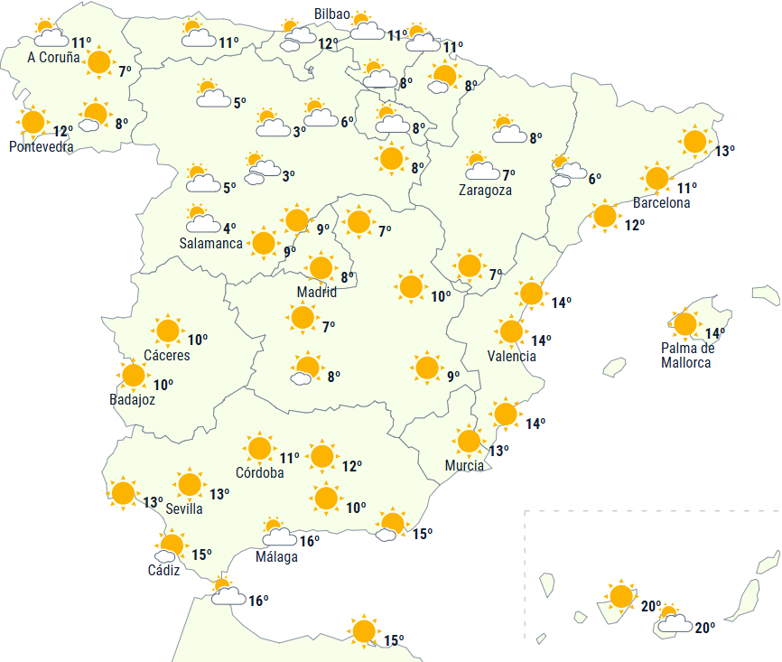 Vejret forventes at forblive stabilt og uden nedbør i det meste af landet. Der er kun en lille sandsynlighed for noget svag og spredt regn i kystområderne i Valencia og Alborán samt nogle byger ledsaget af tordenvejr på De Kanariske Øers højtliggende områder.