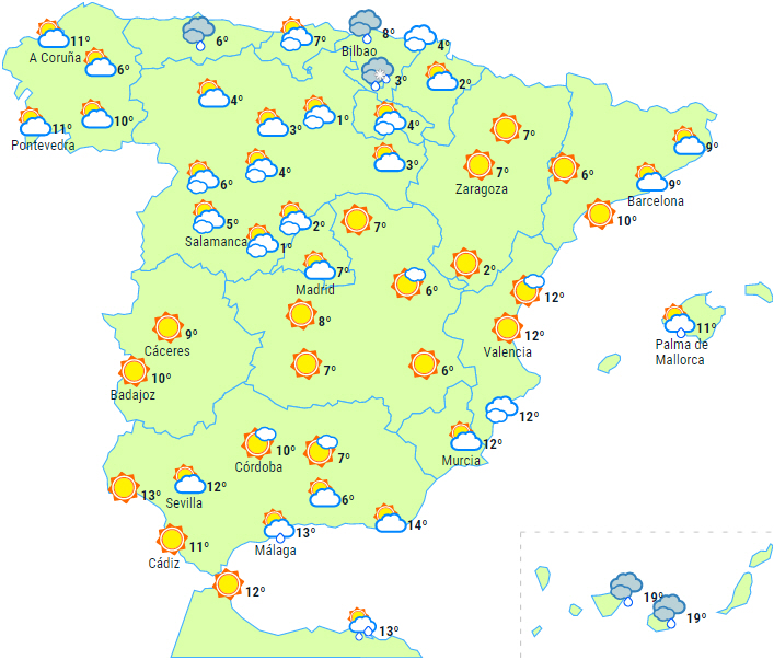 Temperaturerne vil stige på den sydvestlige halvdel af halvøen, både maksimum- og minimumstemperaturerne, mens der sker små ændringer eller lette fald i resten af landet. Bortset fra i det helt sydvestlige område er der udbredt frost i halvøens indre områder - mest intens i bjergene og tung frost i Pyrenæerne.