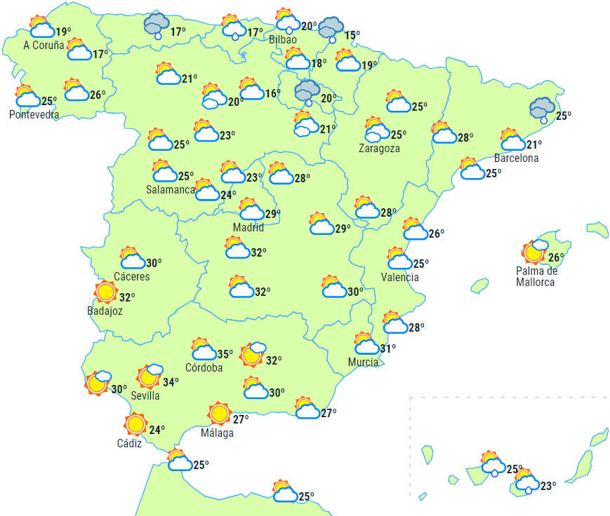 Maksimumstemperaturerne vil have tendens til at stige i den vestlige del af det sydlige højland, langs den andalusiske Middelhavskyst og Balearerne, mens de falder i resten af landet, men især i den øvre og midterste del af Ebro-dalen. Temperaturerne vil overstige 30 grader i dele af det sydlige Atlanterhavsområde.