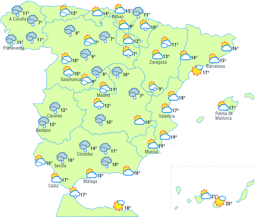 Halvøen og De Baleariske Øer forventes at forblive under indflydelse af lavtryk og passage af flere Atlanterhavsfronter, og det betyder overvejende overskyet himmel og næsten udbredt nedbør.