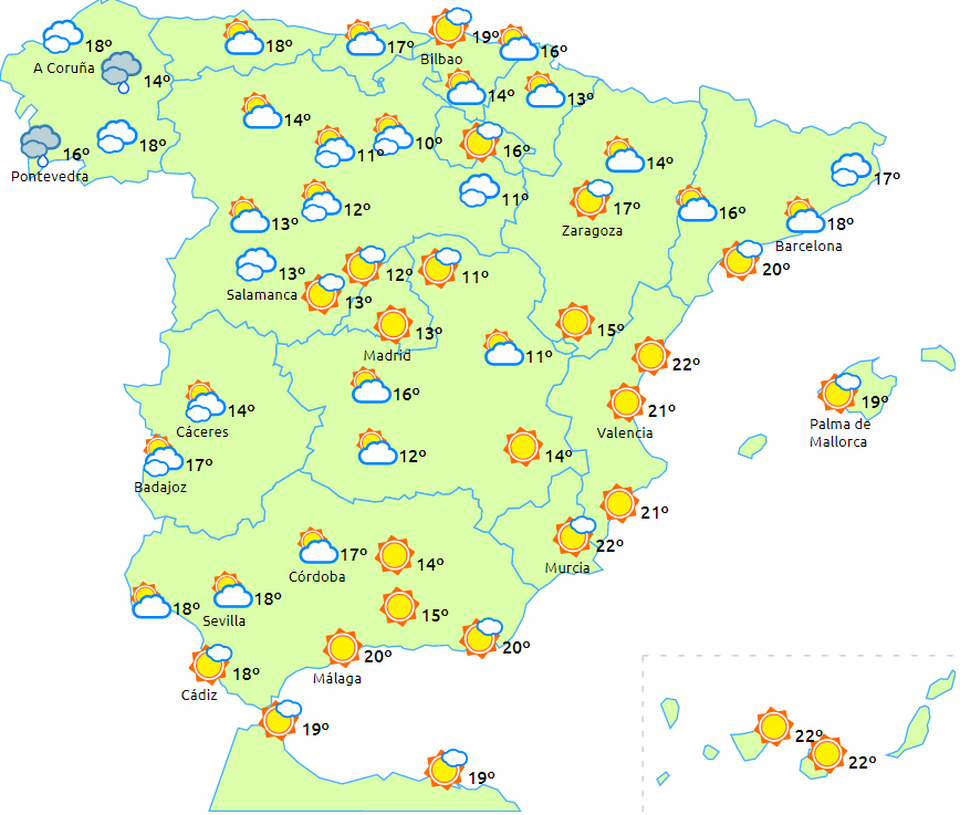 Skyet eller overskyet med nedbør i Galicien og Pyrenæerne. I begyndelsen er det også overskyet i resten af Atlanterhavsregionen og i områderne langs nordvestkysten med mulighed for svag og stedvis nedbør, men med tendens til at opklaring i løbet af dagen.