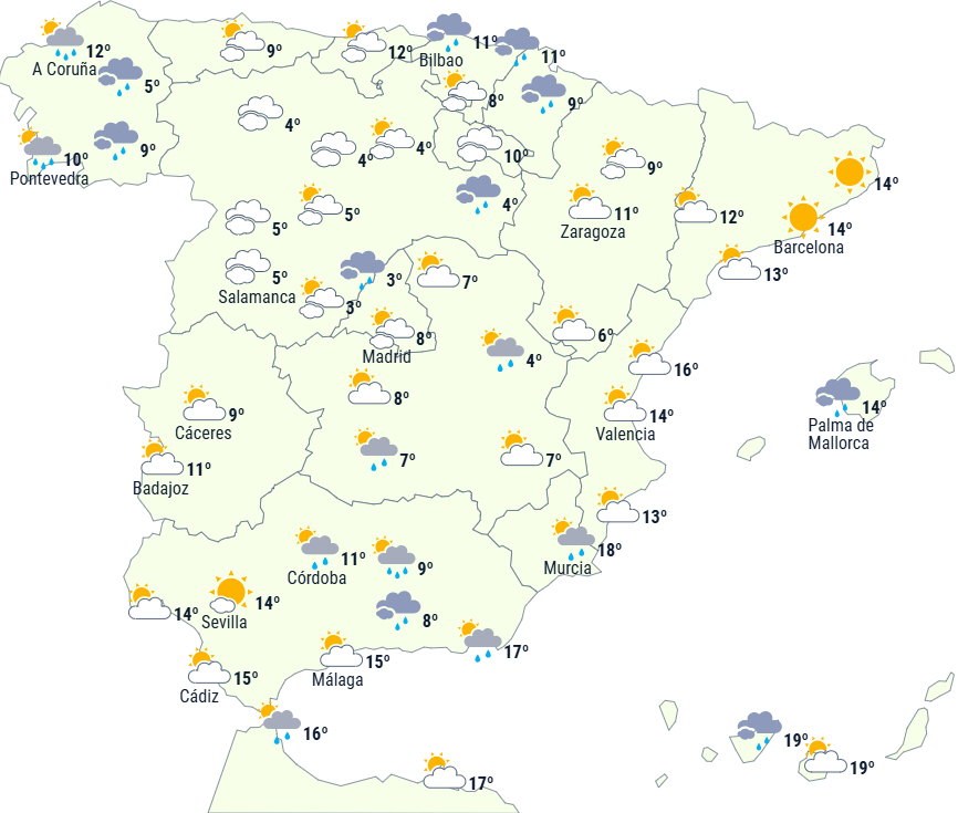 I løbet af dagen forventes skyerne generelt at aftage, og der vil komme opklaring og mindre nedbør, selv om det forventes at fortsætte i Galicien, Det Cantabriske Hav og Pyrenæerne og på De Baleariske Øer i løbet af dagens anden halvdel.