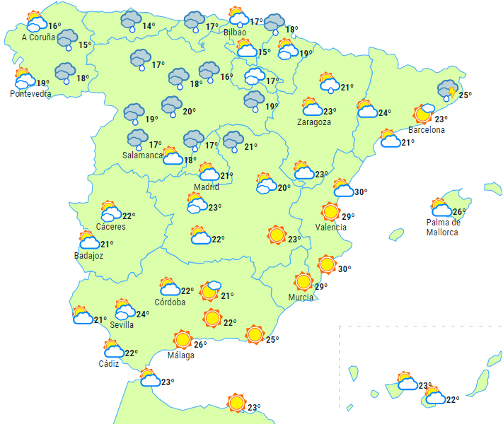 Med en vis usikkerhed om, hvad retning den tager, er det sandsynligt, at DANAen fortsat vil påvirke halvøen. Det betyder rigeligt med skydække og byger og tordenvejr, der bevæger sig fra syd mod nord og påvirker det meste af fastlandet. Nedbøren kan lokalt være kraftig i områder i syd og centrum, i indlandet i nordvest, det nordlige af De Iberiske Bjerge og den øvre Ebro-dal og i de sene timer også indlandet mod øst og sydøst - generelt altså dog aftagende fra syd. Hagl kan forekomme lokalt.