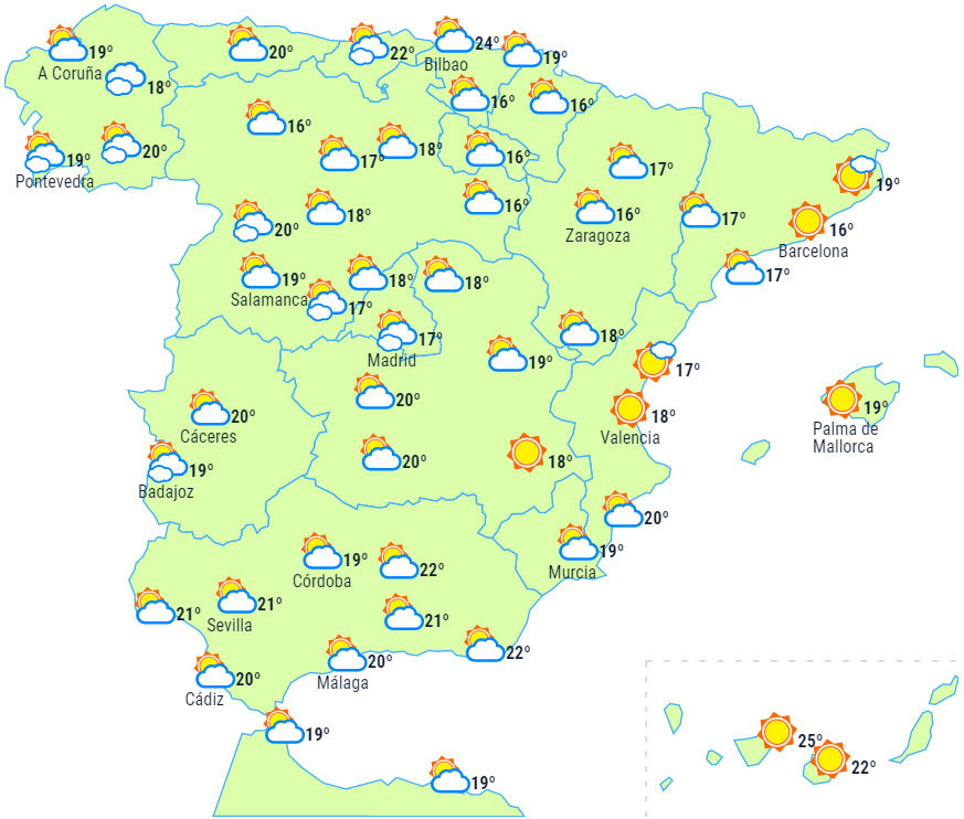 Der forventes også nogle perioder i begyndelsen af dagen med overskyet himmel i området omkring Gibraltarstrædet, Melilla og Levantekysten og mulighed for svag og spredt nedbør i Catalonien, men med tendens til opklaring i løbet af dagen.