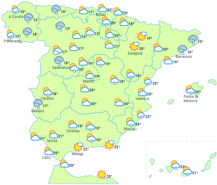 På den østlige halvdel af halvøen og Balearerne forventes ustabiliteten at fortsætte med skyet eller overskyet himmel, nedbør og lejlighedsvis tordenvejr. Regnen kan lokalt være kraftig i Catalonien og på De Baleariske Øer.