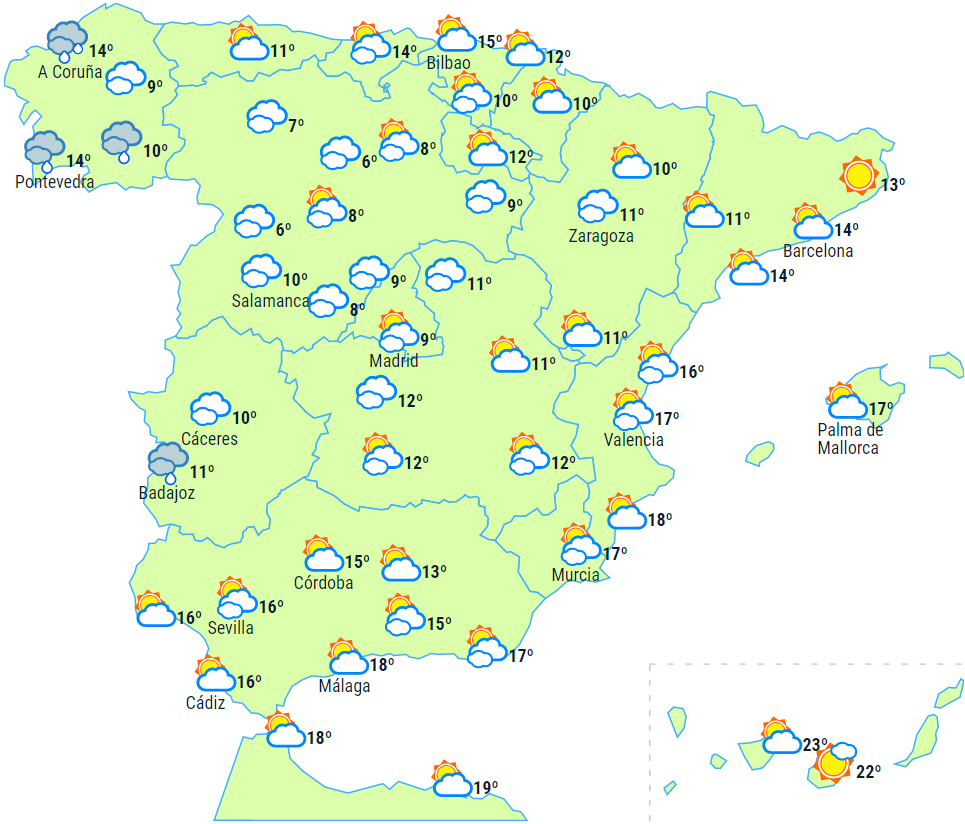 Skyet til overskyet med nedbør i de østlige ende af nordvestkysten, den vestlige halvdel af Pyrenæerne og de østligste af Balearerne - lokalt vedvarende i Guipúzcoa og det nordlige Navarra, som gradvis vil aftage i takt med at skyerne forsvinder.