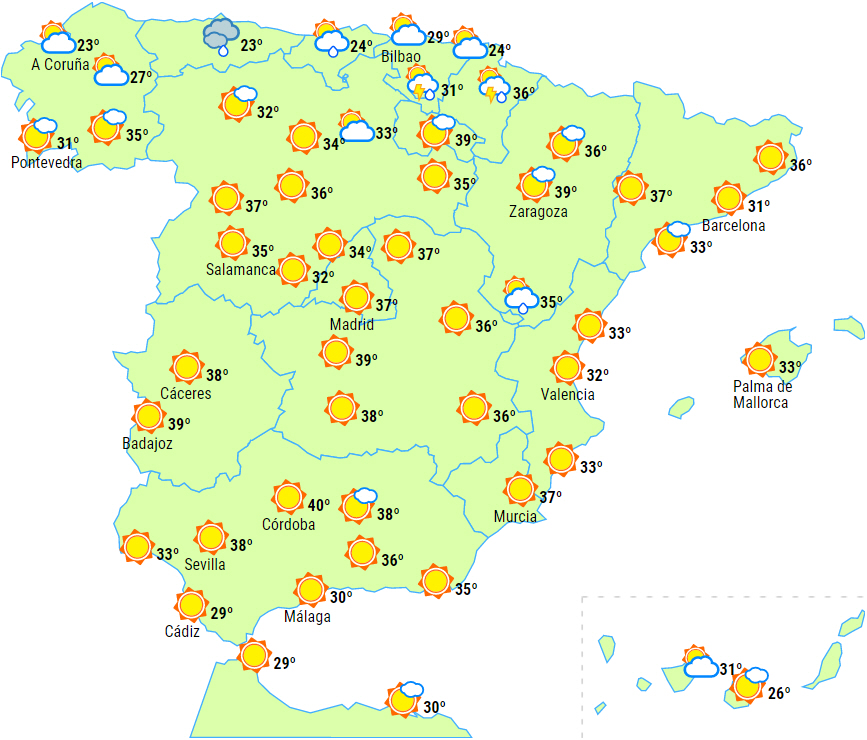 Varsler om høje temperaturer på det meste af halvøen, Balearerne og De Kanariske Øer. Perioder med stærk vind på De Kanariske Øer, og så advares der om sandsynlighed for byger og lokalt kraftige tordenbyger flere steder på halvøen og særligt i Pyrenæerne.
