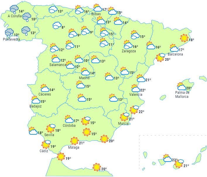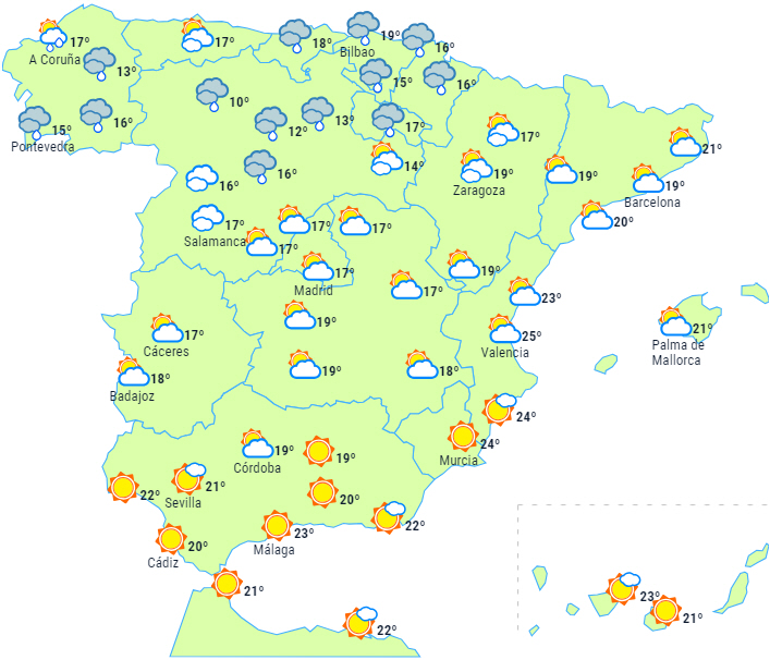 En front forventes at trænge ind over den nordvestlige del af halvøen og give skyet eller overskyet himmel med nedbør i Galicien, svag og spredt i starten og med tendens til at intensivere om eftermiddagen, hvor det forventes, at regnen kan brede sig i svagere form til andre dele af den nordvestlige tredjedel af halvøen.