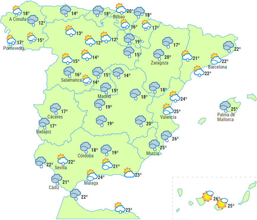 Der ventes nedbør til den nordvestlige tredjedel af halvøen og Pyrenæerne, og det er ikke udelukket, at der lokalt vil komme kraftige byger i den vestlige del af Galicien, som lejlighedsvis kan blive ledsaget af tordenvejr.