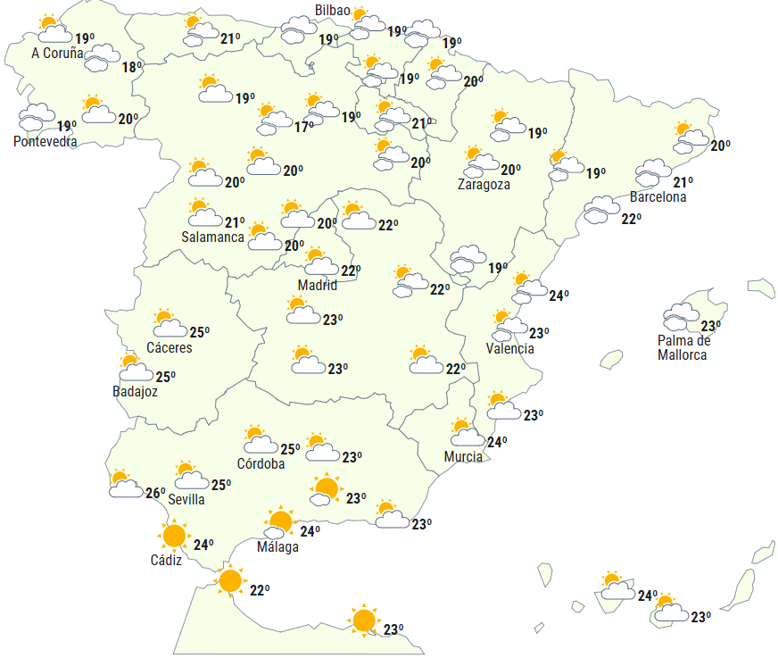 På Den Iberiske Halvø og De Baleariske Øer forventes overvejende stabilt vejr. Ikke desto mindre er det altså sandsynligt, at der kommer øget højtliggende skydække fra nord mod syd, dog mellemhøjtliggende skyer i nordøst og på De Baleariske Øer og lavthængende skyer i Galicien.