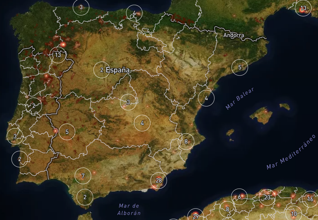 Der er stadig knastørt og brandvarmt rundt omkring i hele Spanien, og det er en farlig cocktail. Derfor har mange regioner også forlænget brandsæsonen til at gælde ind i september også. Den meget høje luftfugtighed i den seneste tid har dog hjulpet gevaldigt, så flere storbrand er kommet under kontrol, og der er nu kun en håndfuld aktive skovbrande.
