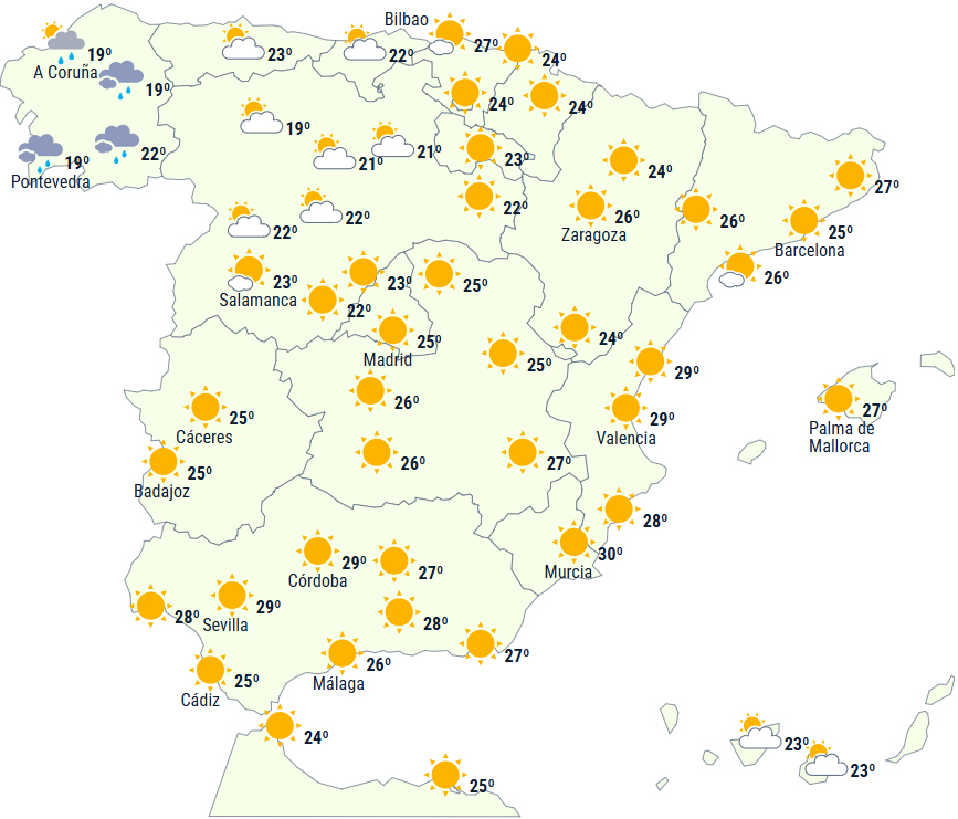 Ligeledes kan der udvikles noget skydække over resten af den nordlige halvdel, og vi kan ikke udelukke enkelte tordenbyger i bjergene og især i indlandet af Galicien og de cantabriske bjerge.