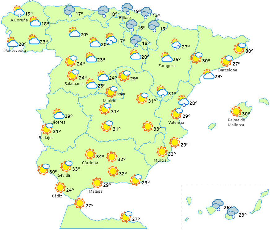 Dagstemperaturerne vil falde næsten over hele linjen, men mest markant i nordøst og i den indre del af Ebro-dalen samt i de vestlige Pyrenæer, mens der kun sker få ændringer eller stigninger i området omkring Alboran, på Balearerne og i Galicien. Temperaturerne forventes at overstige 35 grader i Guadalquivir-dalen og i de sydøstlige indre områder. Nattemperaturerne vil generelt falde.