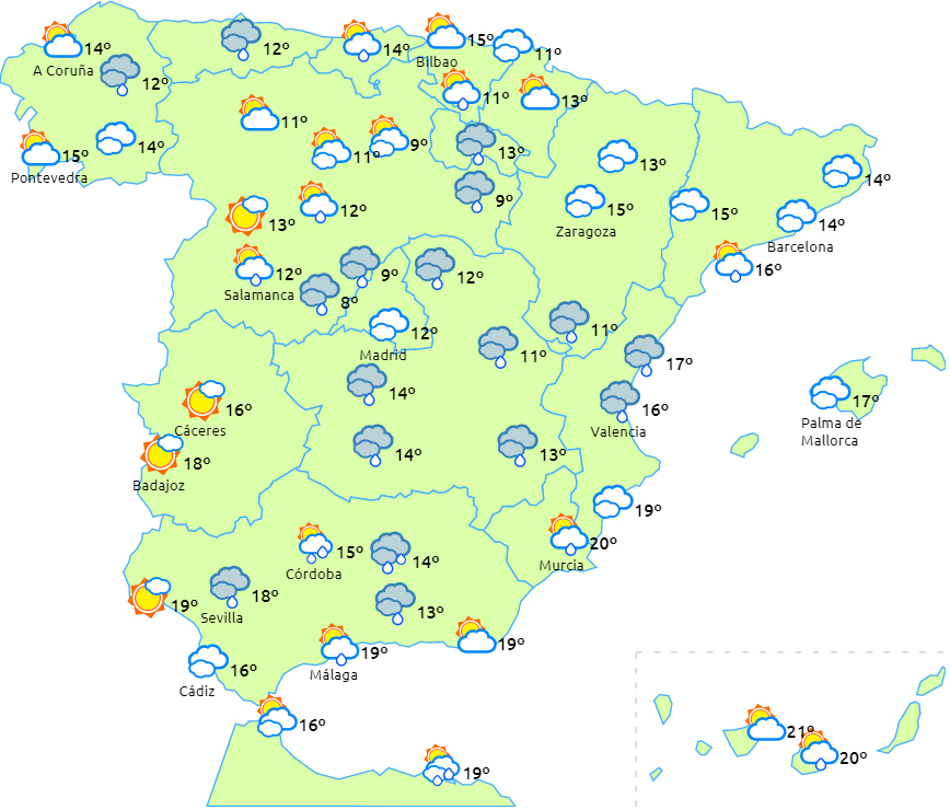 På Halvøen og Balearerne overskyet himmel med spredt nedbør, der breder sig fra vest til øst. Der forventes mest nedbør ved nordvestkysten, i Pyrenæerne, Catalonien, på Balearerne og i de centrale og iberiske bjerge.