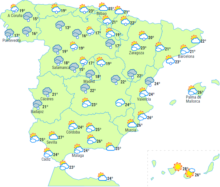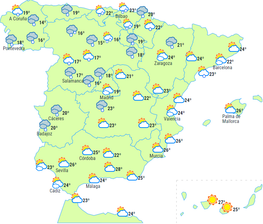 Dagstemperaturerne vil falde i Pyrenæerne og stige ved nordvestkysten og i Aragón. Nattemperaturerne vil falde på den nordvestlige tredjedel af halvøen. Kun få ændringer i resten.