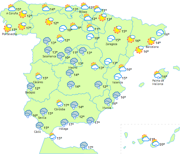 En Atlanterhavsfront, der bevæger sig fra det nordøstlige område af De Kanariske Øer mod Cádizbugten forventes at give skyet eller overskyet himmel over hele den sydlige halvdel af halvøen og Balearerne med kraftig nedbør til den sydvestlige del af Andalusien og lokalt meget kraftig og med torden i Gibraltarstrædet og Melilla.