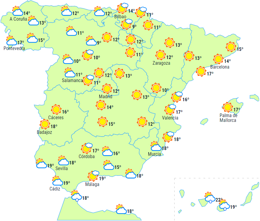 Dagstemperaturerne vil stige i den sydvestlige del af Galicien og falde på halvøens Middelhavskyst og især på De Kanariske Øer. Nattemperaturerne vil falde på De Kanariske Øer og i Pyrenæerne og stige i højlandet og Galicien. Kun få ændringer i resten af landet. Der forventes svag frost i bjergområderne og de tilstødende områder i det centrale og nordlige Spanien, mere intens i Pyrenæerne.