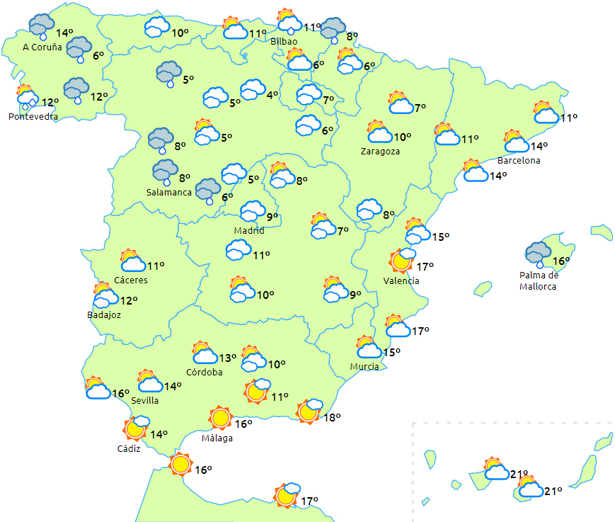 Temperaturerne stiger i Middelhavsområdet og ved den nedre del af Ebro-dalen, mens de falder i resten af landet. Svag frost til sidst på dagen i alle bjergsystemer på halvøen, men mest intens i Pyrenæerne.
