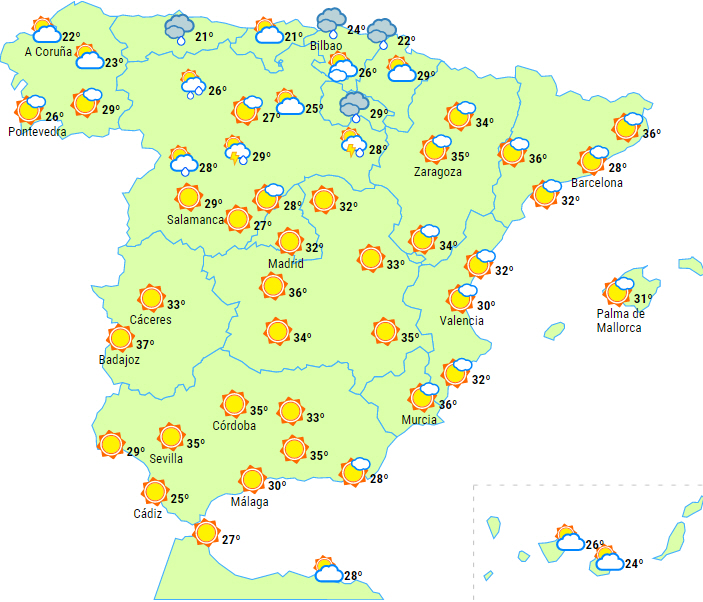 I dag varsles der lokalt kraftigt uvejr til den vestlige halvdel af Pyrenæerne, mens der også advares om meget høje temperaturer på den østlige tredjedel af halvøen og Balearerne.