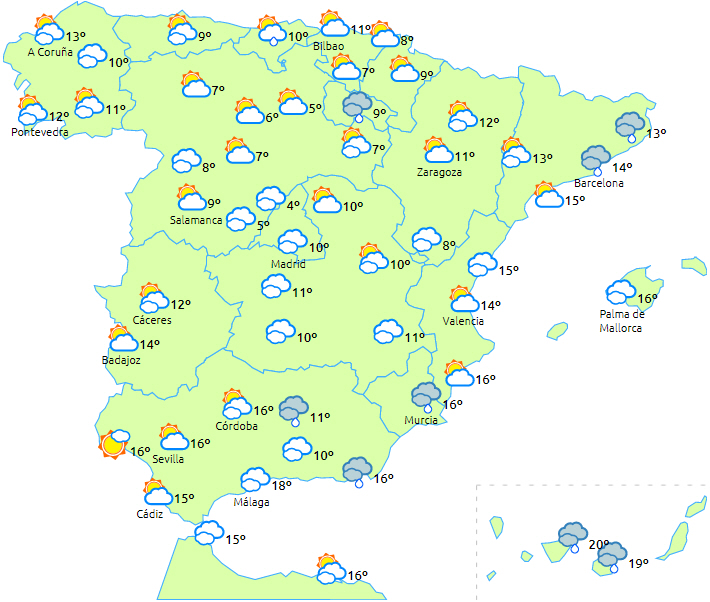 Dagstemperaturerne falder på den nordlige og østlige halvdel af halvøen og på begge øgrupper - særligt mærkbart fald i den østlige tredjedel syd for Ebro-dalen. Nattemperaturerne stiger på den helt nordøstlige del af halvøen, mens de har tendens til at falde på resten af halvøen. Svag frost i bjergene i på sydøstlige del og på den nordlige højslette og mere intens i bjergene i de centrale og nordvestlige egne.