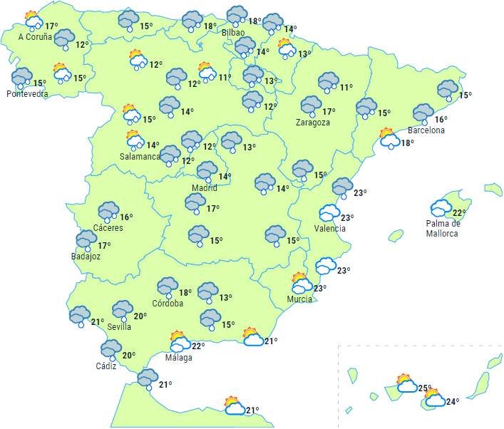 Skyet eller overskyet himmel over det meste af halvøen med nedbør, der breder sig fra sydvest til nordøst i løbet af dagen fra det vestlige Andalusien og Extremadura til resten af Atlanterhavssiden og muligvis når resten af halvøen i svagere og mere spredt form, undtagen i Catalonien og det nordlige Galicien, hvor der ligesom på Balearerne kun vil være overskyet i perioder.