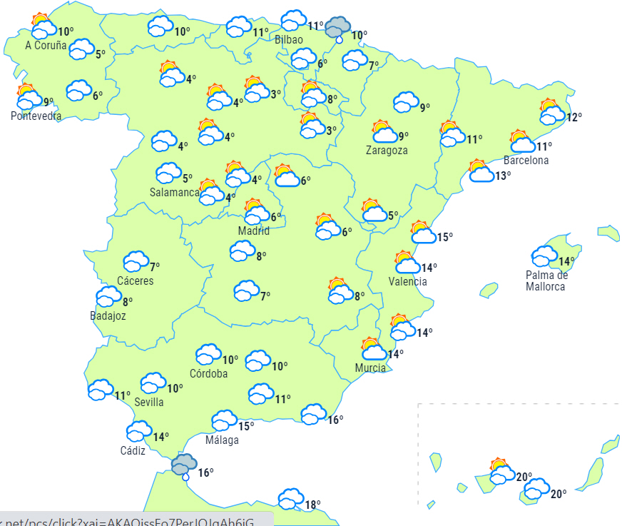 Temperaturerne vil falde i det meste af landet, undtagen på den sydøstlige tredjedel af halvøen og De Kanariske Øer, hvor temperaturerne vil stige. Der forventes svag frost i store dele af indlandsområderne på den nordlige halvdel af halvøen og den nordøstlige del for det sydlige højland. Frosten bliver mere intens i bjergene, endda tung i Pyrenæerne.