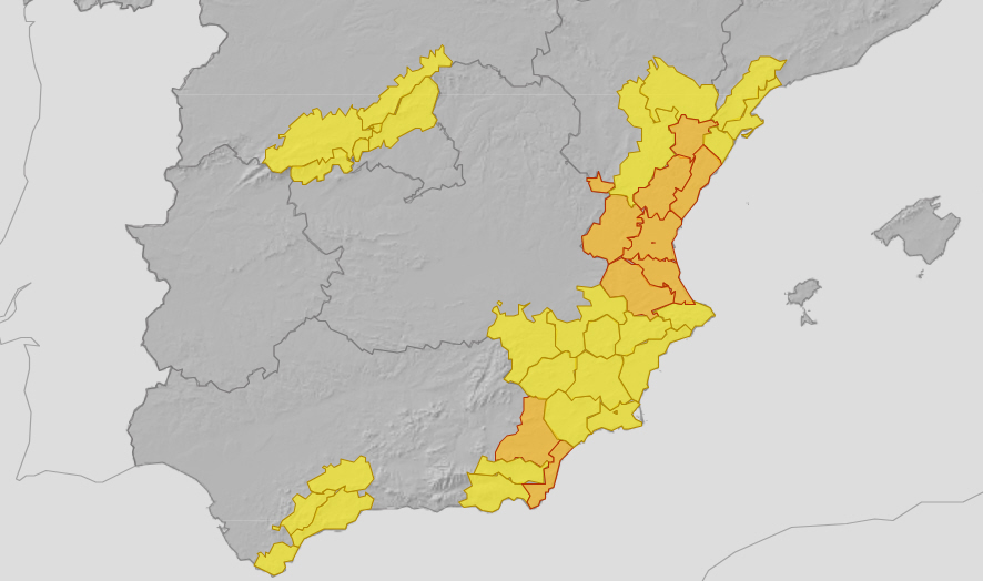Kraftig og/eller vedvarende nedbør til den østlige del af halvøen, men især i Almería, Murcia, Comunidad Valenciana, det sydlige Tarragona og bjergkæderne Gúdar og Maestrazgo samt i det sydlige af Sistema Central.