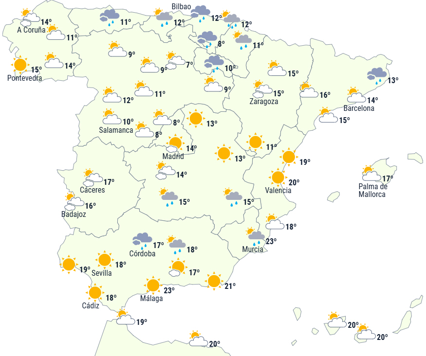 På Den Iberiske Halvø og De Baleariske Øer forventes en atlantisk front at passere, der bevæger sig fra nord til syd og og svækkes efterhånden, men den kan altså smide noget nedbør af sig i de nordlige og nordøstlige områder, på De Baleariske Øer samt i de østlige af De Betiske Bjerge.