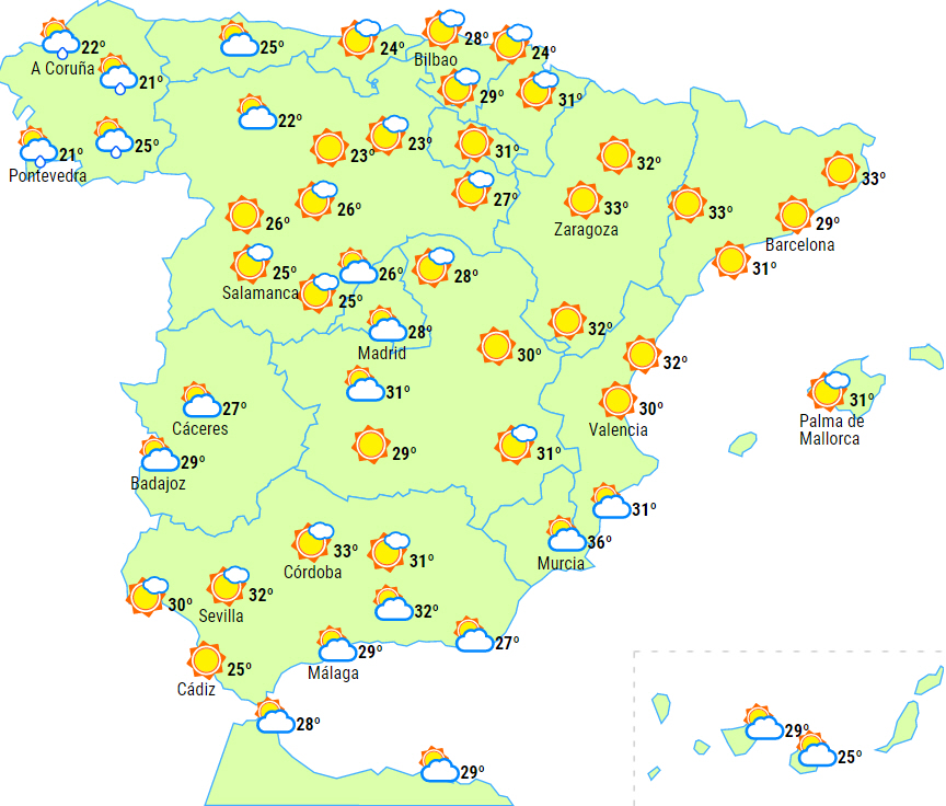 Der forventes dog efterhånden nogle skyer over den nordvestlige halvdel af halvøen og mellem- og højtliggende skyer over den sydøstlige del og på Balearerne.