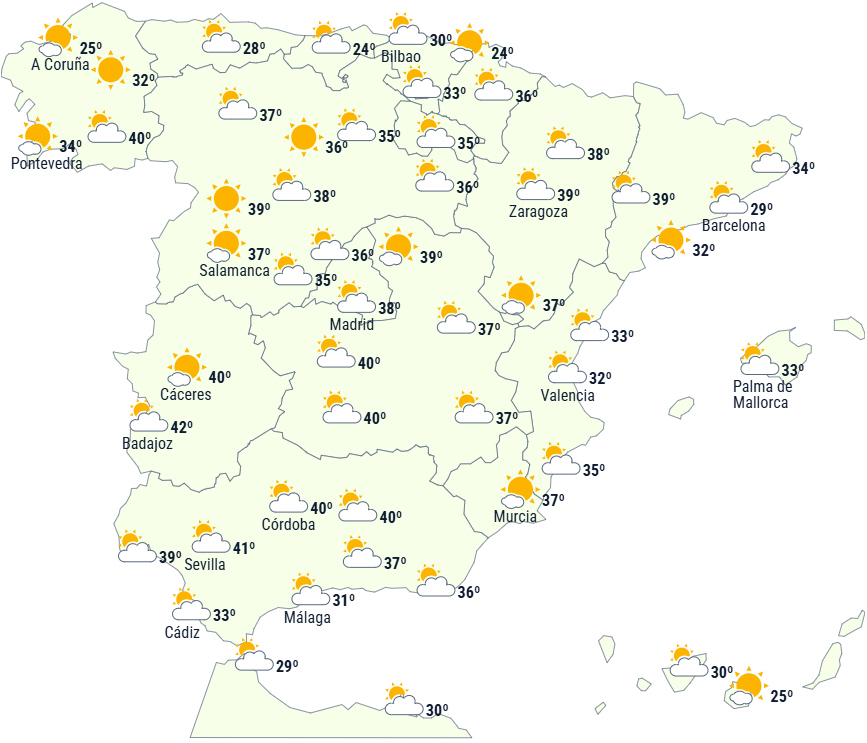 Temperaturerne vil ligge på 34 til 36 grader på størstedelen af Den Iberiske Halvø samt i enkelte områder af begge øgrupper, dog op til 40 grader på store dele af den sydlige halvdel af den atlantiske side.