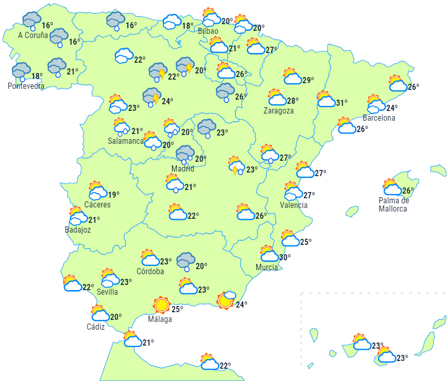 Et lavtryk fra Atlanterhavet ventes at nærme sig halvøen fra sydvest, og det giver overvejende skyet himmel, som vil være mindre rigelig over den østlige tredjedel og De Baleariske Øer.