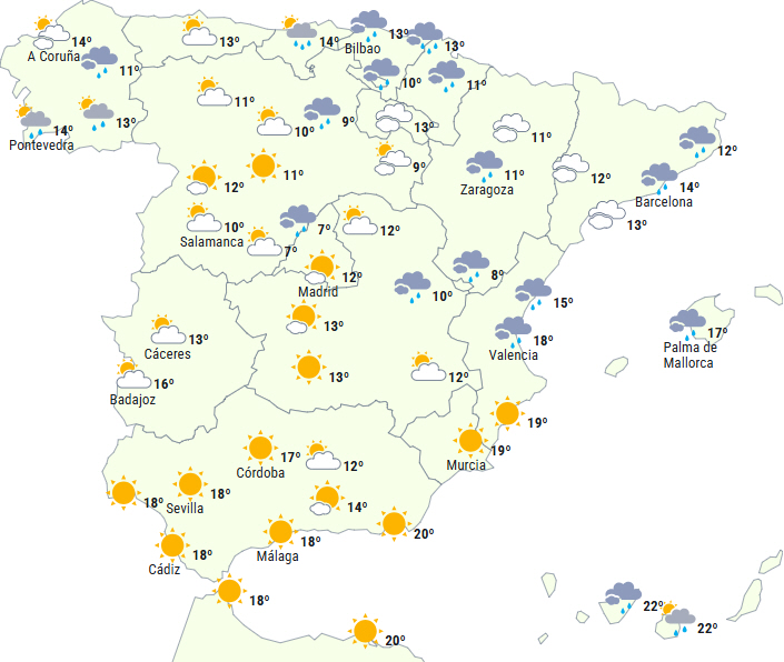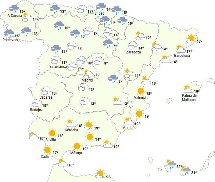 Ankomsten af en ny front vil give overskyet eller letskyet himmel med udbredte byger, mindre hyppige og svagere på den sydøstlige ende af Den Iberiske Halvø. I Galicien forventes byger, der lejlighedsvis ledsages af torden og muligvis hagl. Nedbøren kan lokalt være kraftig i dagens første halvdel i Rías Baixas og det vestlige A Coruña og faktisk kaste betydelige mængder af sig.