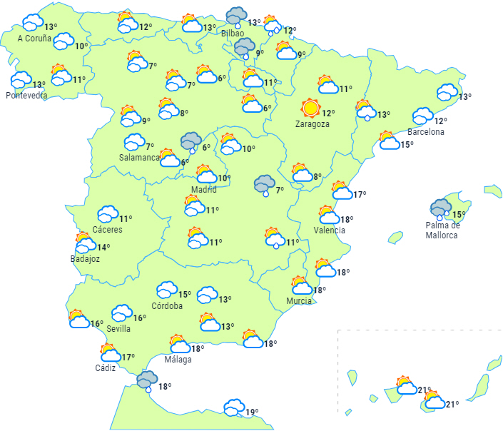 Nedbøren vil gradvist ophøre i løbet af dagen og bliver afløst af vekslende skydække undtagen i nordvest, ved Det Cantabriske Hav og i Pyrenæerne, hvor gråvejret ventes at fortsætte.