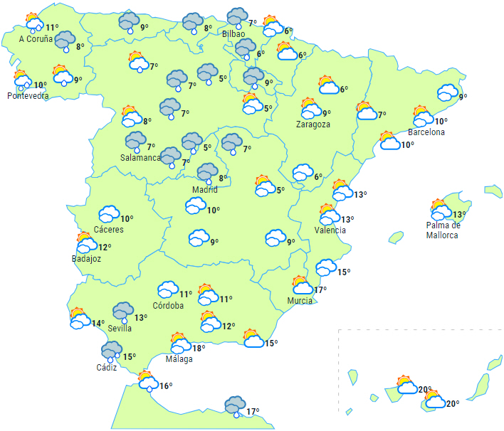 Der forventes en nordvestlig Atlanterhavsvind på halvøen, og med den kommer en Atlanterhavsfront fra vest. Derfor forventes der overskyet himmel over den nordlige del af halvøen med let nedbør ved nordvestkysten, den øvre Ebro-dal, de iberiske bjerge, Pyrenæerne og de nærliggende områder.